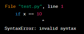 Syntax Errors: These occur when the code violates the rules of the programming language. It usually results in the code not being able to run at all. Syntax errors are identified by the interpreter, and the line number where the error occurs is usually displayed. For example, in Python, forgetting to put a colon at the end of an if statement will result in a syntax error: