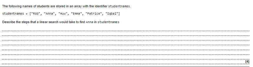 How can you identify linear search in Python code or pseudocode? Answer: Linear search can be identified in Python code or pseudocode by the use of a loop that checks each element in the data set until the desired element is found or the end of the set is reached.