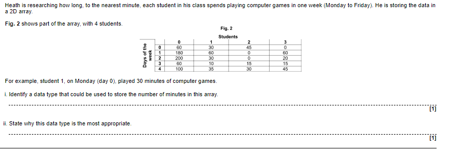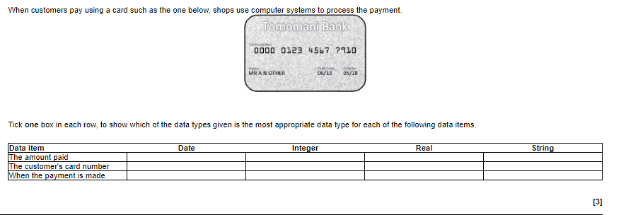 The use of data types in programming such as Integer, Real, Boolean, Character and string